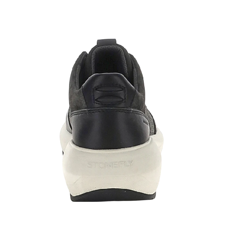 El tipo de calzado es una zapatilla deportiva casual para mujer, modelo Twins con un diseño de estilo moderno en tonos negros y grises con efecto brillante/laminado y silueta de plataforma.Tiene una tecnología que incorpora la tecnología Blusoft Memory® para una excelente amortiguación en el talón y transpirabilidad, i utiliza materialesde una combinación de piel nobuk y textil, con suela ligera de goma EVA.