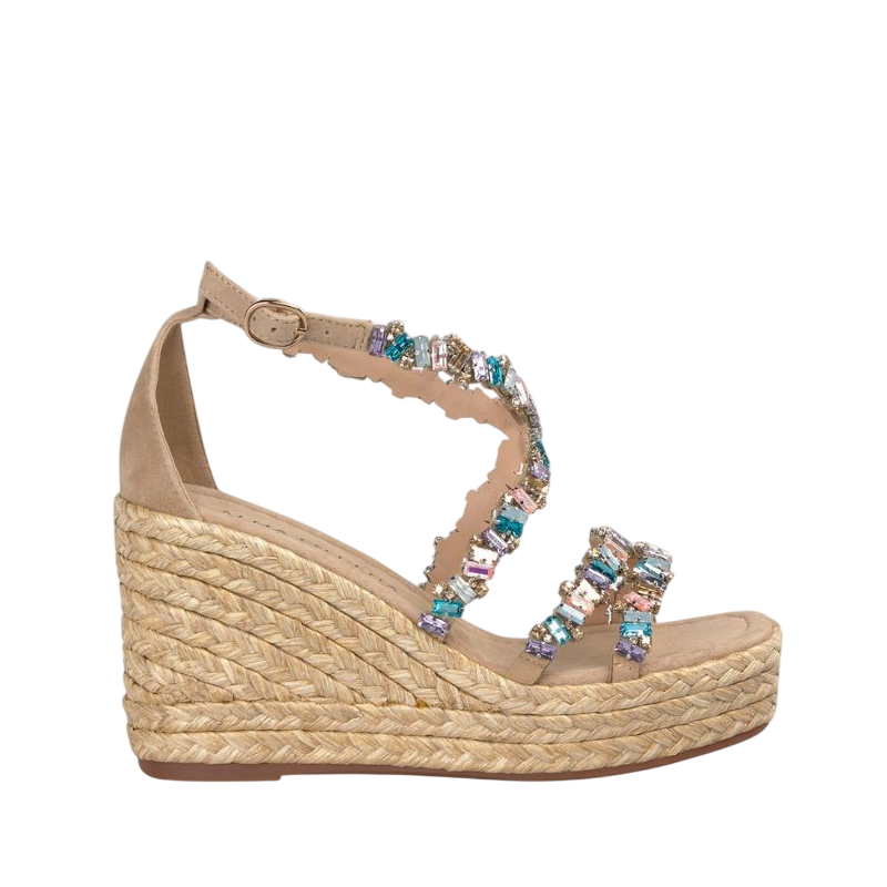 Las sandalias Alma en Pena V251272 son un modelo elegante y sofisticado diseñado especialmente para ocasiones festivas. Están confeccionadas en ante con detalles brillantes tipo bijou en las tiras que aportan un toque glamoroso y femenino. Cuentan con una cuña de casi 10 cm y una plataforma de 2 cm que garantizan altura y comodidad a la vez. El cierre con sibilla y el talón cerrado aseguran una buena sujeción, haciéndolas ideales para lucir durante horas en celebraciones eventos o noches especiales.
